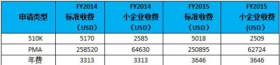如2015财政年的510(k)申请,标准收费为USD5018,小企业收费为USD2509;2015财政年的PMA申请,标准收费为USD250,895,小企业收费为USD62,724。可以看出,有小企业资质的企业所需缴纳的费用确实比普通企业减少许多。不过,对于年费,普通企业与小企业需缴纳的金额是一样的。对比2014财政年(FY2014)的收费,见下表:
