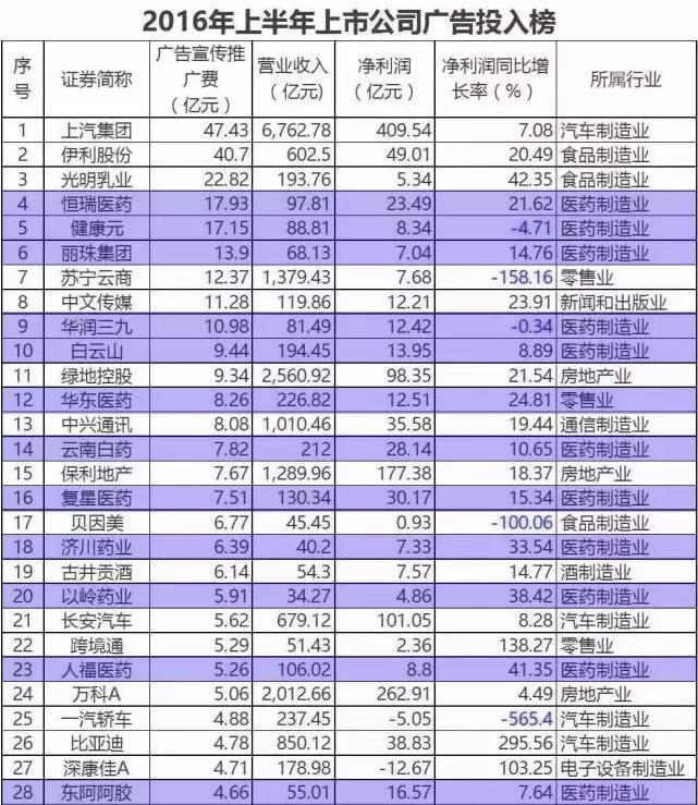 日前, 21世纪营销公众号发布 “2016年上半年上市公司广告投入榜”。在广告投入排名前55位的上市公司中,药企占了19席。