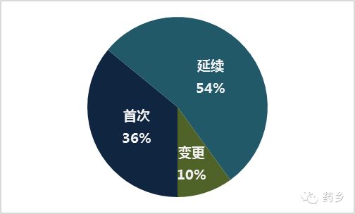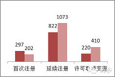 从注册形式看,首次注册申请1562项,占40%;延续注册申请1635项,占42%;许可事项变更注册申请724项,占18%。