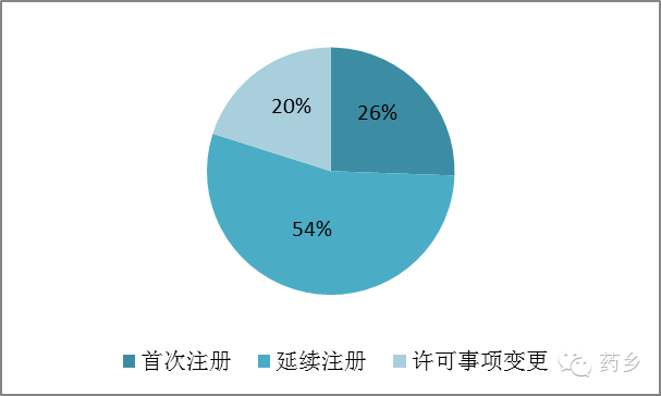 从注册形式看,首次注册申请499项,占17%;延续注册申请1895项,占63%;许可事项变更注册申请,占20%。